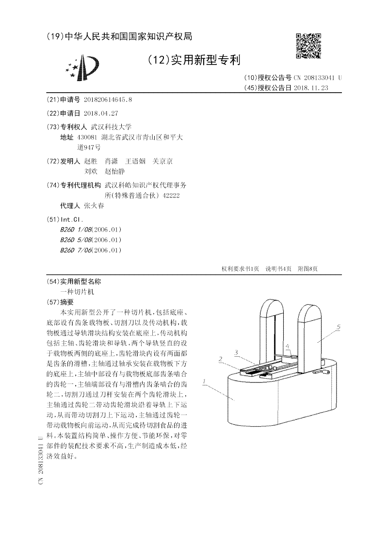本实用新型公开了一种切片机,包括底座、底部设有齿条载物板、切割刀以及传动机构,载物板通过导轨滑块结构安装在底座上,传动机构包括主轴、齿轮滑块和导轨,两个导轨竖直的设于载物板两侧的底座上,齿轮滑块内设有两面都是齿条的滑槽,主轴通过轴承安装在载物板下方的底座上,主轴中部设有与载物板底部齿条啮合的齿轮一,主轴端部设有与滑槽内齿条啮合的齿轮二,切割刀通过刀杆安装在两个齿轮滑块上,主轴通过齿轮二带动齿轮滑块沿着导轨上下运动,从而带动切割刀上下运动,主轴通过齿轮一带动载物板向前运动,从而完成待切割食品的进料。本装置结构简单、操作方便、节能环保,对零部件的装配技术要求不高,生产制造成本低,经济效益好。