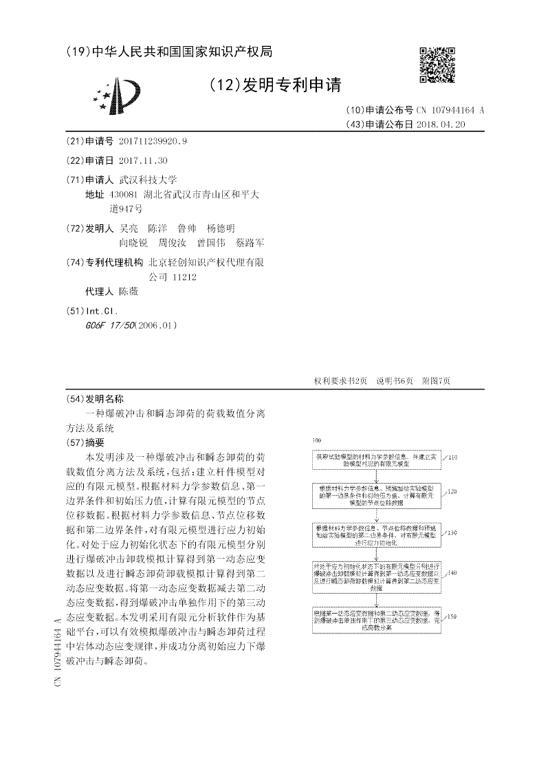 本发明涉及一种爆破冲击和瞬态卸荷的荷载数值分离方法及系统,包括:建立杆件模型对应的有限元模型。根据材料力学参数信息、第一边界条件和初始压力值,计算有限元模型的节点位移数据。根据材料力学参数信息、节点位移数据和第二边界条件,对有限元模型进行应力初始化。对处于应力初始化状态下的有限元模型分别进行爆破冲击卸载模拟计算得到第一动态应变数据以及进行瞬态卸荷卸载模拟计算得到第二动态应变数据。将第一动态应变数据减去第二动态应变数据,得到爆破冲击单独作用下的第三动态应变数据。本发明采用有限元分析软件作为基础平台,可以有效模拟爆破冲击与瞬态卸荷过程中岩体动态应变规律,并成功分离初始应力下爆破冲击与瞬态卸荷。