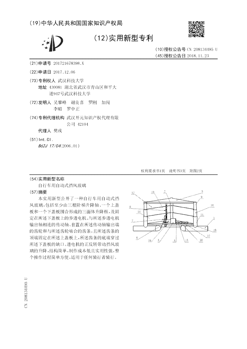本实用新型公开了一种自行车用自动式挡风玻璃,包括至少由三根阶梯升降轴、一个上盖板和一个下盖板围合形成的三面体升降框,及固定在所述下盖板上的步进电机、与所述步进电机输出轴相连的传动轴、套置在所述传动轴输出端的齿轮和与所述齿轮啮合的齿条,且所述齿条的顶端固定在所述上盖板上,所述齿条的底端穿过所述下盖板的缺口。进电机的正反转带动挡风玻璃的升降,结构简单,制作成本低且实用性强,整个操作过程简单方便,适用于任何骑行者骑行。