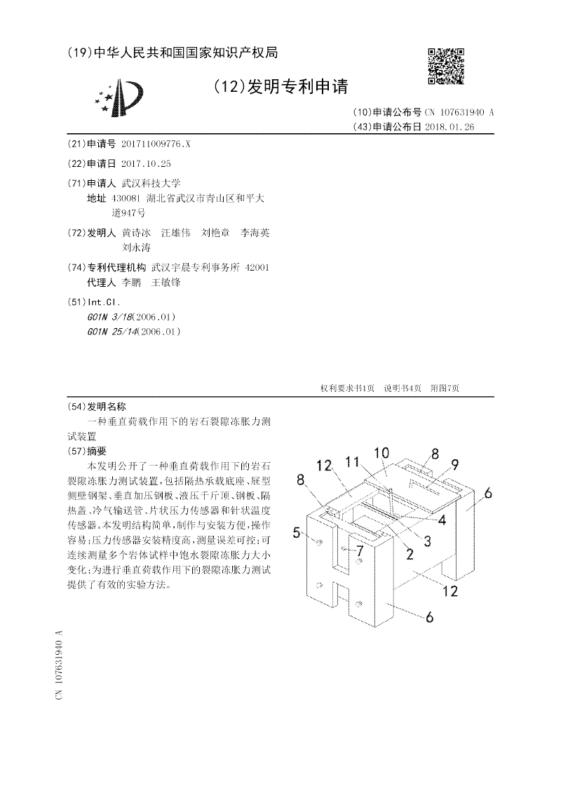 本实用新型公开了一种垂直荷载作用下的岩石裂隙冻胀力测试装置,包括隔热承载底座、屉型侧壁钢架、垂直加压钢板、液压千斤顶、钢板、隔热盖、冷气输送管、片状压力传感器和针状温度传感器。本实用新型结构简单,制作与安装方便,操作容易;压力传感器安装精度高,测量误差可控;可连续测量多个岩体试样中饱水裂隙冻胀力大小变化;为进行垂直荷载作用下的裂隙冻胀力测试提供了有效的实验方法。
