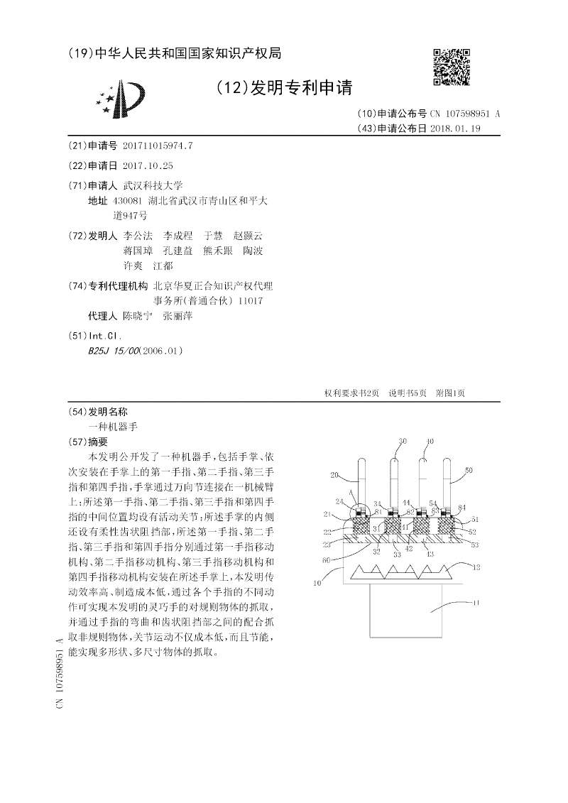 本发明公开发了一种机器手,包括手掌、依次安装在手掌上的第一手指、第二手指、第三手指和第四手指,手掌通过万向节连接在一机械臂上;所述第一手指、第二手指、第三手指和第四手指的中间位置均设有活动关节;所述手掌的内侧还设有柔性齿状阻挡部,所述第一手指、第二手指、第三手指和第四手指分别通过第一手指移动机构、第二手指移动机构、第三手指移动机构和第四手指移动机构安装在所述手掌上,本发明传动效率高、制造成本低,通过各个手指的不同动作可实现本发明的灵巧手的对规则物体的抓取,并通过手指的弯曲和齿状阻挡部之间的配合抓取非规则物体,关节运动不仅成本低,而且节能,能实现多形状、多尺寸物体的抓取。
