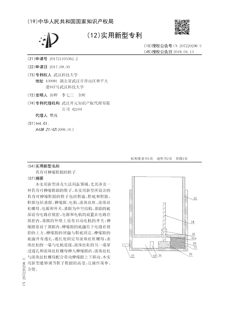本实用新型涉及生活用品领域,尤其涉及一种具有可伸缩鞋跟的鞋子。本实用新型所设计的具有可伸缩鞋跟的鞋子包括鞋面、鞋底和鞋跟,鞋跟包括基跟、伸缩跟、电机、滚珠丝杠、滚珠丝杠螺母、电源和开关,基跟为中空结构,基跟的底部设有电路存放腔,电源和电机均设置在电路存放腔内,基跟的外壁上设有启动电机的开关;伸缩跟套设于基跟内,伸缩跟的底面位于电路存放腔的上方,伸缩跟的顶面与鞋底固定,伸缩跟的底面开有通孔,通孔处固定有滚珠丝杠螺母;滚珠丝杠的一端与电机连接,滚珠丝杠的另一端穿过通孔和滚珠丝杠螺母伸入伸缩跟内,滚珠丝杠与滚珠丝杠螺母配合带动伸缩跟上下移动。本实用新型能够调节鞋子鞋跟的高度,且操作简单、方便。