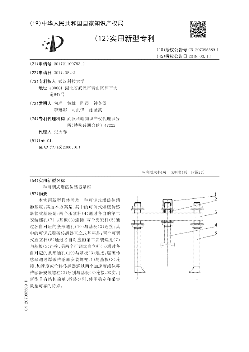 本实用新型具体涉及一种可调式爆破传感器基座。其技术方案是:其中的可调式爆破传感器管式基座是:两个压紧杆(4)通过各自的第二安装螺孔(7)与基板(3)连接,两个夹紧杆(5)通过各自对应的条形通孔(10)与基板(3)连接;其中的可调式爆破传感器直立式基座是:两个可调式直立杆(6)通过各自对应的第二安装螺孔(7)与基板(3)连接,另两个可调式直立杆(6)通过各自对应的条形通孔(10)与基板(3)连接。爆破传感器通过爆破传感器安装螺柱(1)与基板(3)连接,加速度或位移传感器通过两个加速度或位移传感器安装螺柱(2)分别与基板(3)连接。本实用新型具有结构简单、拆装分别、使用稳定和采集数据可靠的特点。
