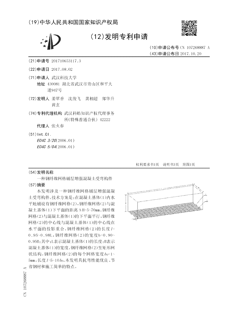 本发明涉及一种钢纤维网格铺层增强混凝土受弯构件。技术方案是;在混凝土基体(1)内水平地铺设有钢纤维网格(2),钢纤维网格(2)与混凝土基体(1)下平面的距离ΔH=5~70mm。钢纤维网格(2)与混凝土基体(1)的下平面平行,钢纤维网格(2)的中心线与混凝土基体(1)的中心线在水平面的投影重合。钢纤维网格(2)的长度l=0.95~0.98L,钢纤维网格(2)的宽度b=0.90~0.95B;其中:L表示混凝土基体(1)的长度;B表示混凝土基体(1)的宽度。钢纤维网格(2)呈矩形网状结构,钢纤维网格(2)的每个网格宽度b0=1~5mm,长度l=5~10b0。本发明具抗弯性能优良、节省钢材和施工简单的特点。