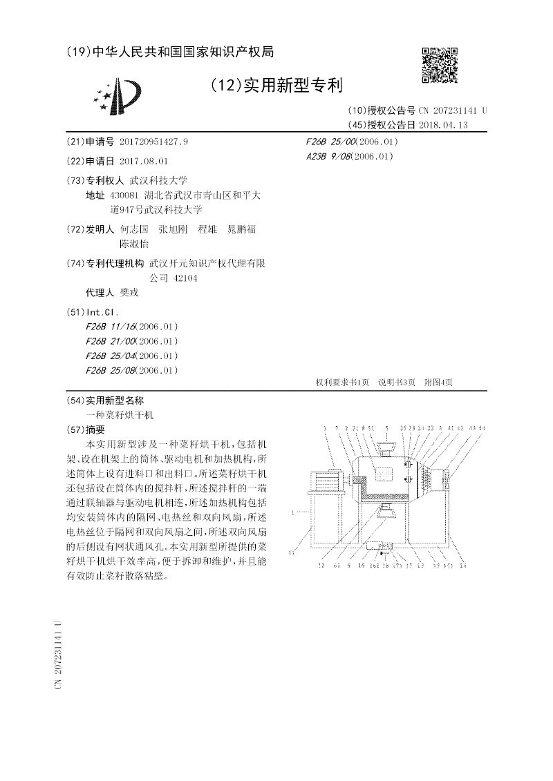 本实用新型涉及一种菜籽烘干机,包括机架、设在机架上的筒体、驱动电机和加热机构,所述筒体上设有进料口和出料口。所述菜籽烘干机还包括设在筒体内的搅拌杆,所述搅拌杆的一端通过联轴器与驱动电机相连,所述加热机构包括均安装筒体内的隔网、电热丝和双向风扇,所述电热丝位于隔网和双向风扇之间,所述双向风扇的后侧设有网状通风孔。本实用新型所提供的菜籽烘干机烘干效率高,便于拆卸和维护,并且能有效防止菜籽散落粘壁。