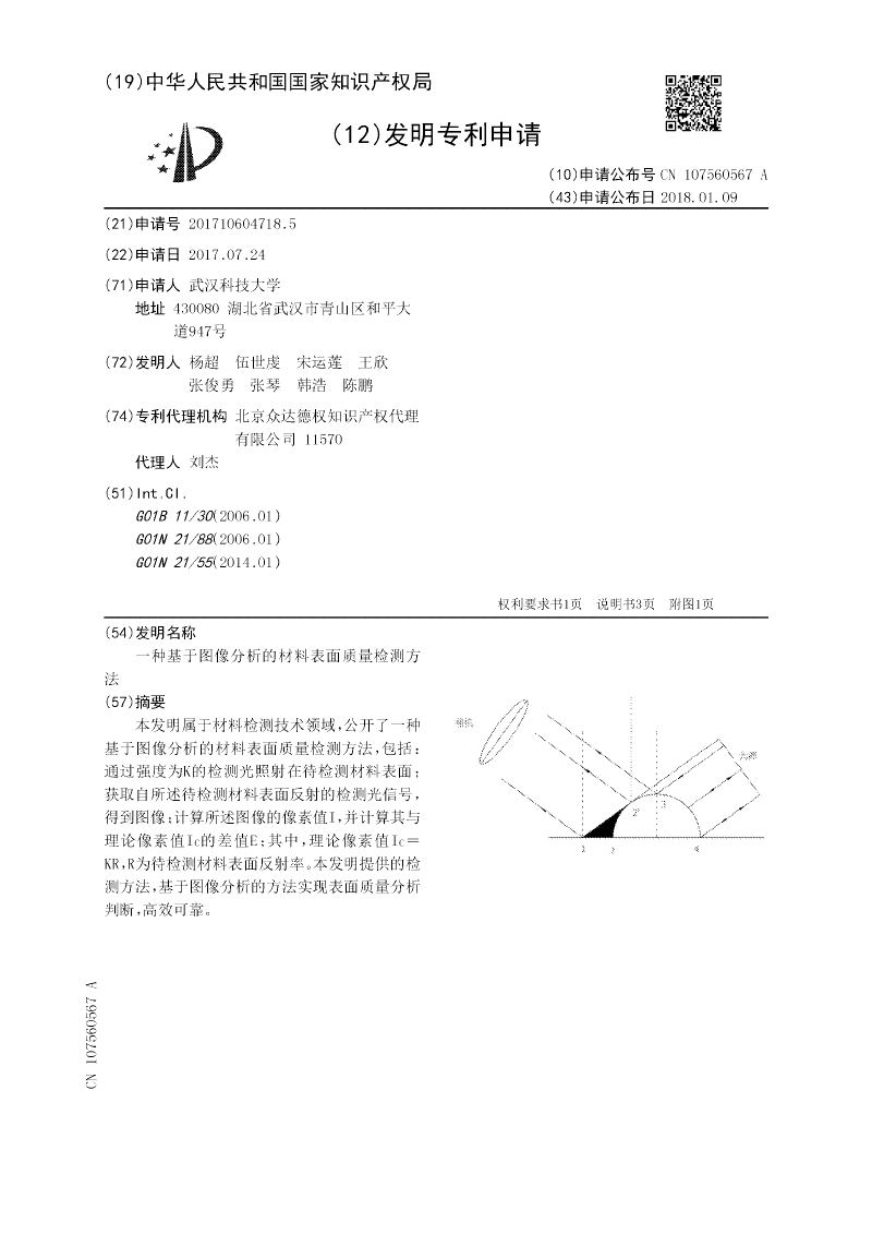 本发明属于材料检测技术领域,公开了一种基于图像分析的材料表面质量检测方法,包括:通过强度为K的检测光照射在待检测材料表面;获取自所述待检测材料表面反射的检测光信号,得到图像;计算所述图像的像素值I,并计算其与理论像素值IC的差值E;其中,理论像素值IC=KR,R为待检测材料表面反射率。本发明提供的检测方法,基于图像分析的方法实现表面质量分析判断,高效可靠。