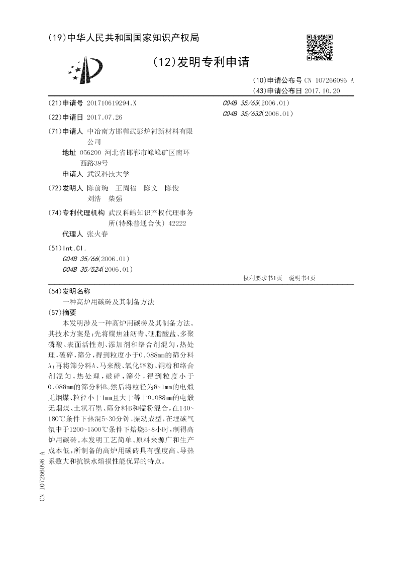中冶南方邯郸武彭炉衬新材料有限公司、武汉科技大学