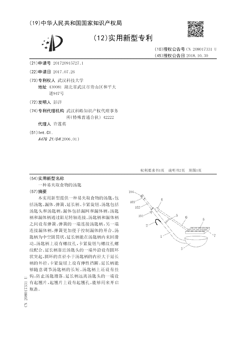 本实用新型提供一种易夹取食物的汤匙,包括汤匙、漏体、弹簧、延长柄、卡紧旋钮,汤匙包括汤匙头和汤匙柄,漏体包括漏网和漏体柄,汤匙柄和漏体柄通过阻尼转轴连接。汤匙柄和漏体柄之间设有弹簧,弹簧的一端连接汤匙柄,另一端连接漏体柄,弹簧更加便于控制漏体的开合。汤匙柄为中空圆筒状,延长柄能在汤匙柄内来回滑动,汤匙柄上设有螺纹孔,卡紧旋钮与螺纹孔螺纹配合。延长柄靠近汤匙头的一端外沿设有圆环状突起,圆环的直径小于汤匙柄的内径大于延长柄的外径,卡紧旋钮上设有弹性挡圈,延长柄能够随意调节汤匙柄的长短。汤匙柄上还设有挂钩,防止汤匙滑落。延长柄远离汤匙头的一端设有起翘片,起翘片上设有起翘孔,能够用来开启瓶盖。