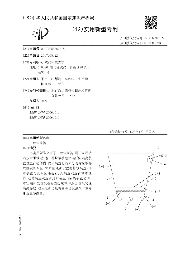 本实用新型公开了一种垃圾篓,属于家用清洁技术领域。所述一种垃圾篓包括:篓体;隔离装置设置在篓体内,隔离装置将篓体分隔为垃圾存放区及沥水区,沥水区底部设置有排水装置,排水装置与沥水区连通;过滤装置设置在沥水区内,过滤装置设置在排水装置与隔离装置之间。本实用新型垃圾篓将固态垃圾和液态垃圾实现隔离存放,避免液态垃圾将固态垃圾泡烂产生异味及更多细菌。