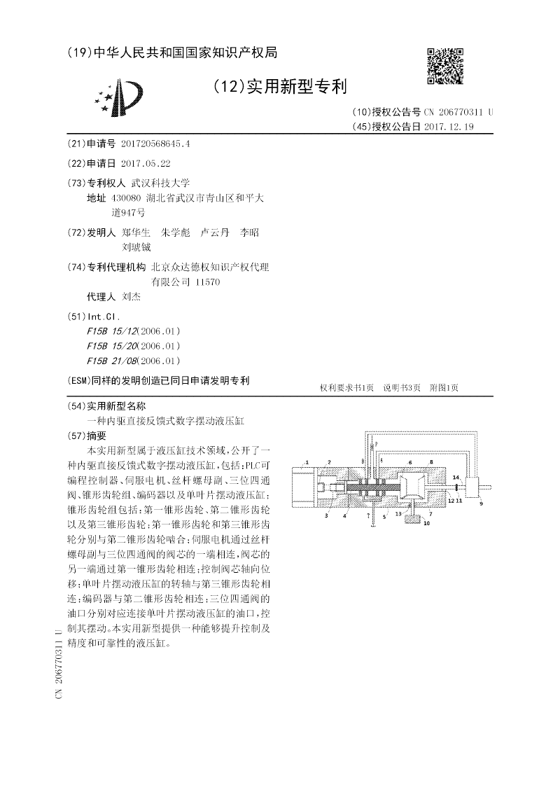 本实用新型属于液压缸技术领域,公开了一种内驱直接反馈式数字摆动液压缸,包括:PLC可编程控制器、伺服电机、丝杆螺母副、三位四通阀、锥形齿轮组、编码器以及单叶片摆动液压缸;锥形齿轮组包括:第一锥形齿轮、第二锥形齿轮以及第三锥形齿轮;第一锥形齿轮和第三锥形齿轮分别与第二锥形齿轮啮合;伺服电机通过丝杆螺母副与三位四通阀的阀芯的一端相连,阀芯的另一端通过第一锥形齿轮相连;控制阀芯轴向位移;单叶片摆动液压缸的转轴与第三锥形齿轮相连;编码器与第二锥形齿轮相连;三位四通阀的油口分别对应连接单叶片摆动液压缸的油口,控制其摆动。本实用新型提供一种能够提升控制及精度和可靠性的液压缸。