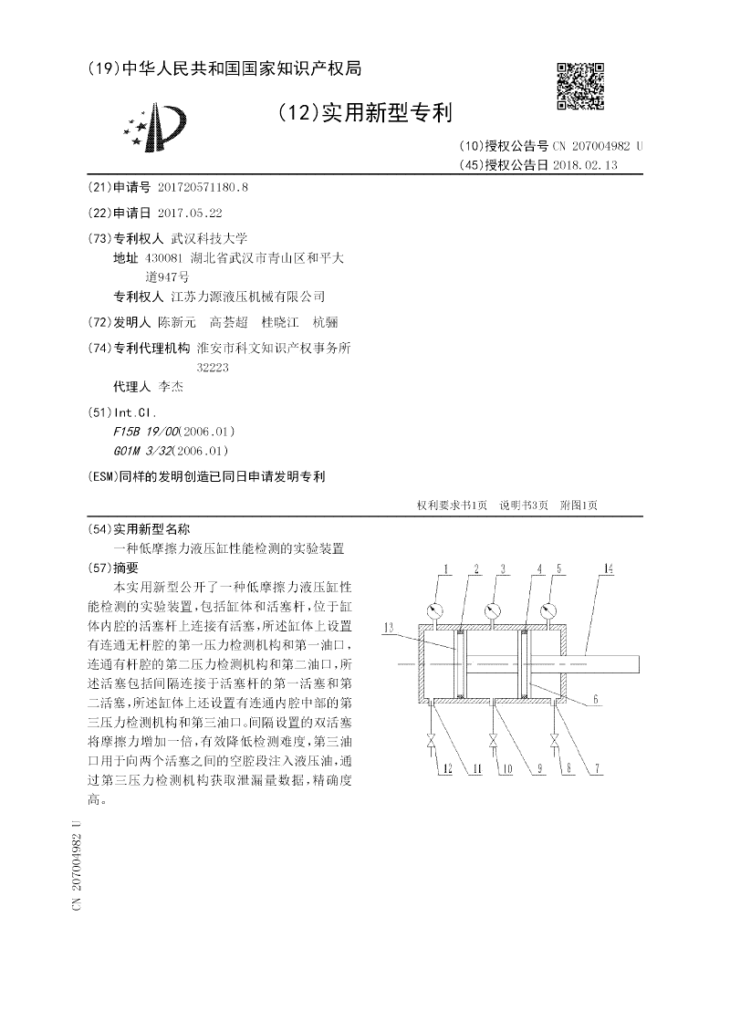 本实用新型公开了一种低摩擦力液压缸性能检测的实验装置,包括缸体和活塞杆,位于缸体内腔的活塞杆上连接有活塞,所述缸体上设置有连通无杆腔的第一压力检测机构和第一油口,连通有杆腔的第二压力检测机构和第二油口,所述活塞包括间隔连接于活塞杆的第一活塞和第二活塞,所述缸体上还设置有连通内腔中部的第三压力检测机构和第三油口。间隔设置的双活塞将摩擦力增加一倍,有效降低检测难度,第三油口用于向两个活塞之间的空腔段注入液压油,通过第三压力检测机构获取泄漏量数据,精确度高。
