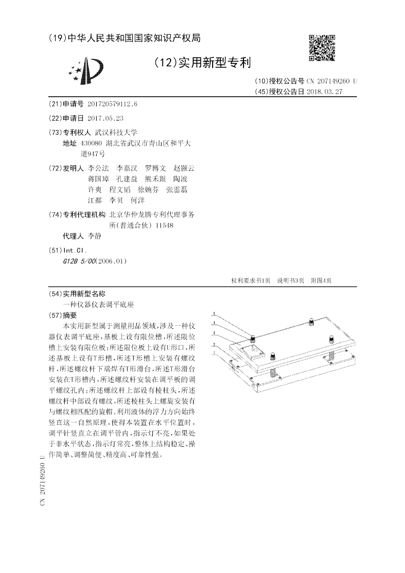 本实用新型属于测量用品领域,涉及一种仪器仪表调平底座,基板上设有限位槽,所述限位槽上安装有限位板;所述限位板上设有U形口,所述基板上设有T形槽,所述T形槽上安装有螺纹杆,所述螺纹杆下端焊有T形滑台,所述T形滑台安装在T形槽内,所述螺纹杆安装在调平板的调平螺纹孔内;所述螺纹杆上部设有棱柱头,所述螺纹杆中部设有螺纹,所述棱柱头上螺旋安装有与螺纹相匹配的旋帽。利用液体的浮力方向始终竖直这一自然原理,使得本装置在水平位置时,调平针竖直立在调平管内,指示灯不亮,如果处于非水平状态,指示灯常亮,整体上结构稳定、操作简单、调整简便、精度高、可靠性强。