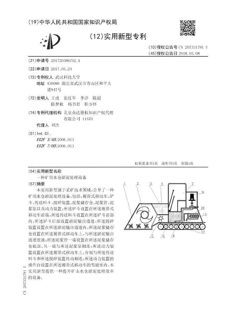 本实用新型属于采矿技术领域,公开了一种矿用水仓淤泥处理设备,包括:履带式移动车、铲斗、传送料斗、搅碎装置、泥浆储存仓、泥浆管、泥浆泵以及动力装置;所述铲斗设置在所述履带式移动车前端;所述传送料斗设置在所述铲斗前部内;所述铲斗后部设置淤泥输出通道,所述搅碎装置设置在所述淤泥输出通道内;所述泥浆储存仓设置在所述履带式移动车上,与所述淤泥输出通道连通;所述泥浆管一端设置在所述泥浆储存仓底部,另一端与所述泥浆泵相连;所述动力装置设置在所述履带式移动车上,分别与所述传送料斗和所述搅碎装置传动相连;所述动力装置的操作台设置在所述履带式移动车的驾驶室内。本实用新型提供一种提升矿山水仓淤泥处理效率的设备。