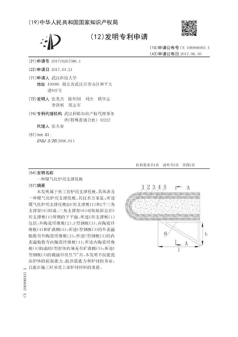 本发明属于热工窑炉用支撑托板。具体涉及一种煤气化炉用支撑托板。其技术方案是:所述煤气化炉用支撑托板由U形支撑板(1)和2个三角支撑架(6)组成,三角支撑架(6)对称地固定在U形支撑板(1)两侧的下平面。所述U形支撑板(1)包括:外陶瓷纤维板(2)、U型钢板(3)、内陶瓷纤维板(4)和矿渣棉(5);所述U型钢板(3)的外表面贴敷有外陶瓷纤维板(2),所述U型钢板(3)的内表面贴敷有内陶瓷纤维板(4),所述内陶瓷纤维板(4)构成的U型腔体内填充有矿渣棉(5);所述U型钢板(3)的截面形状呈“U”形。本发明不仅能提高炉体的抗振能力、抗热震能力和炉衬的寿命,且能在施工时承受上部炉衬材料的重量。