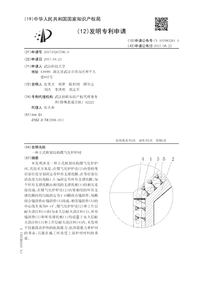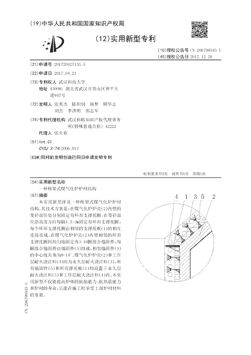 本实用新型涉及一种框架式煤气化炉炉衬结构。其技术方案是:在煤气化炉炉壳(2)内壁的变径部位处分别固定有环形支撑托圈,在等径部位沿高度方向每隔1.5~3m固定有环形支撑托圈,每个环形支撑托圈由相邻的支撑托板(1)的相互连接而成。在煤气化炉炉壳(2)内壁相邻的环形支撑托圈间均匀地固定有3~10圈组合锚固件,每圈组合锚固件由锚固件(5)组成,相邻锚固件(5)的中心线夹角为9~14°。煤气化炉炉壳(2)和工作层耐火浇注料(4)间为永久层耐火浇注料(3),所有锚固件(5)和所有撑托板(1)均设置于永久层耐火浇注料(3)和工作层耐火浇注料(4)内。本实用新型不仅能提高炉体的抗振能力、抗热震能力和炉衬的寿命,且能在施工时承受上部炉衬材料的重量。
