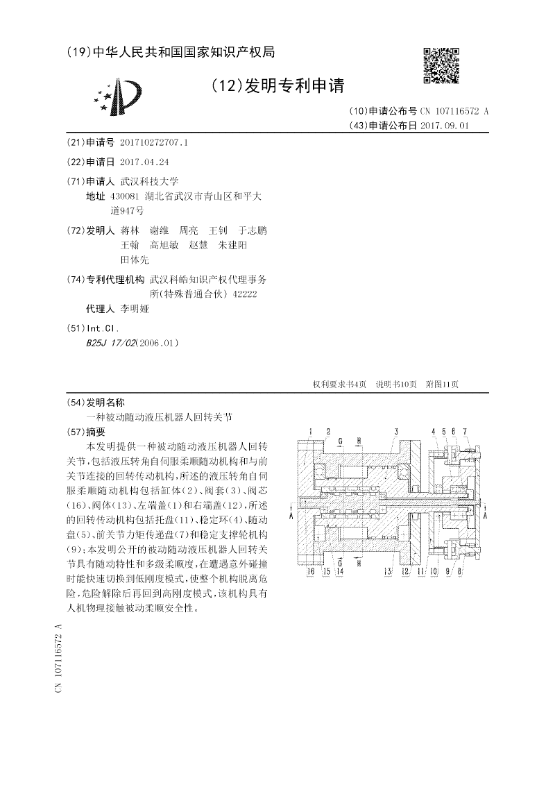 本发明提供一种被动随动液压机器人回转关节,包括液压转角自伺服柔顺随动机构和与前关节连接的回转传动机构,所述的液压转角自伺服柔顺随动机构包括缸体(2)、阀套(3)、阀芯(16)、阀体(13)、左端盖(1)和右端盖(12),所述的回转传动机构包括托盘(11)、稳定环(4)、随动盘(5)、前关节力矩传递盘(7)和稳定支撑轮机构(9);本发明公开的被动随动液压机器人回转关节具有随动特性和多级柔顺度,在遭遇意外碰撞时能快速切换到低刚度模式,使整个机构脱离危险,危险解除后再回到高刚度模式,该机构具有人机物理接触被动柔顺安全性。