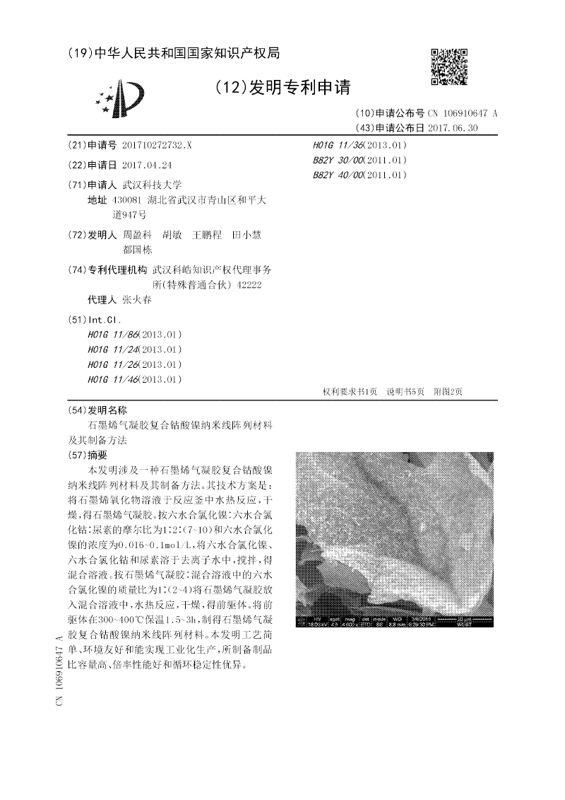 石墨烯气凝胶复合钴酸镍纳米线阵列材料及其制备方法