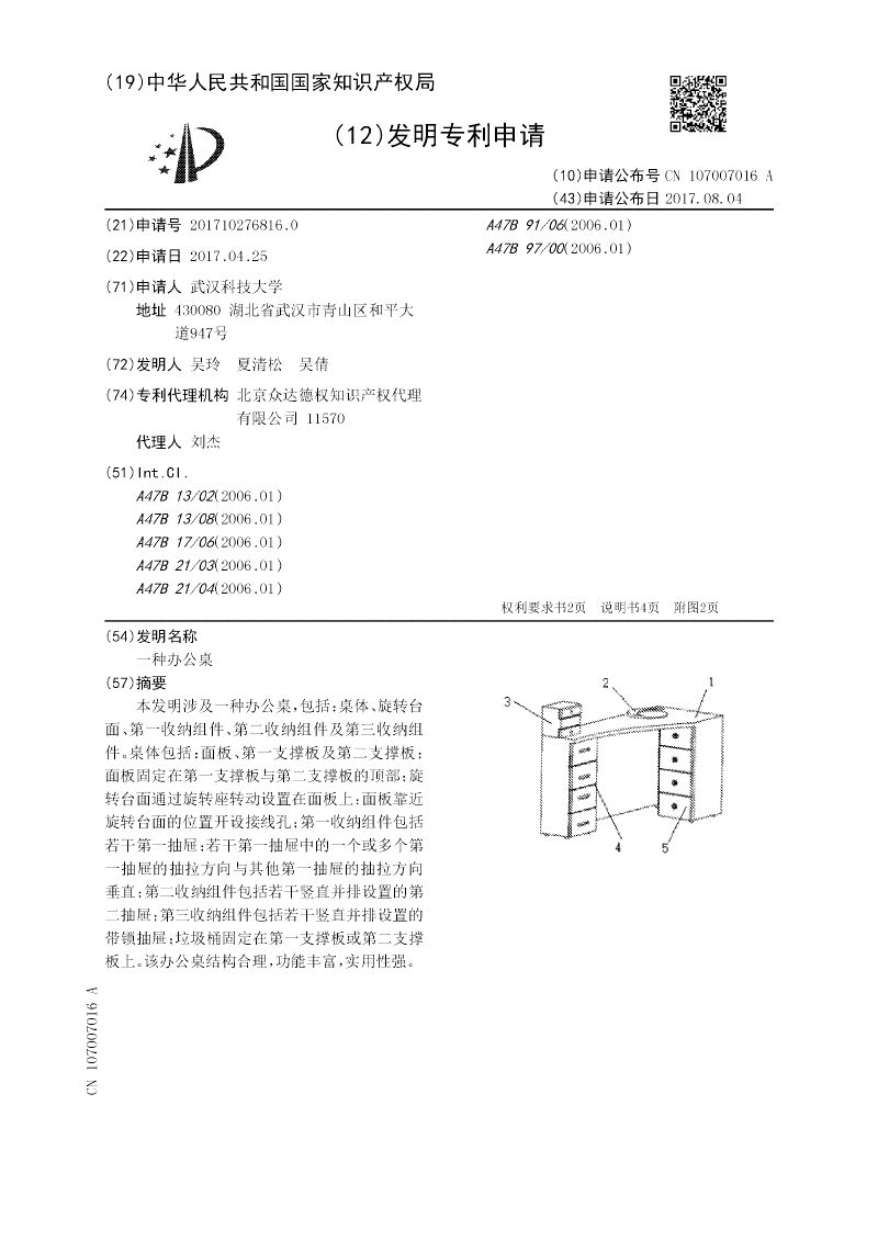 本发明涉及一种办公桌,包括:桌体、旋转台面、第一收纳组件、第二收纳组件及第三收纳组件。桌体包括:面板、第一支撑板及第二支撑板;面板固定在第一支撑板与第二支撑板的顶部;旋转台面通过旋转座转动设置在面板上;面板靠近旋转台面的位置开设接线孔;第一收纳组件包括若干第一抽屉;若干第一抽屉中的一个或多个第一抽屉的抽拉方向与其他第一抽屉的抽拉方向垂直;第二收纳组件包括若干竖直并排设置的第二抽屉;第三收纳组件包括若干竖直并排设置的带锁抽屉;垃圾桶固定在第一支撑板或第二支撑板上。该办公桌结构合理,功能丰富,实用性强。