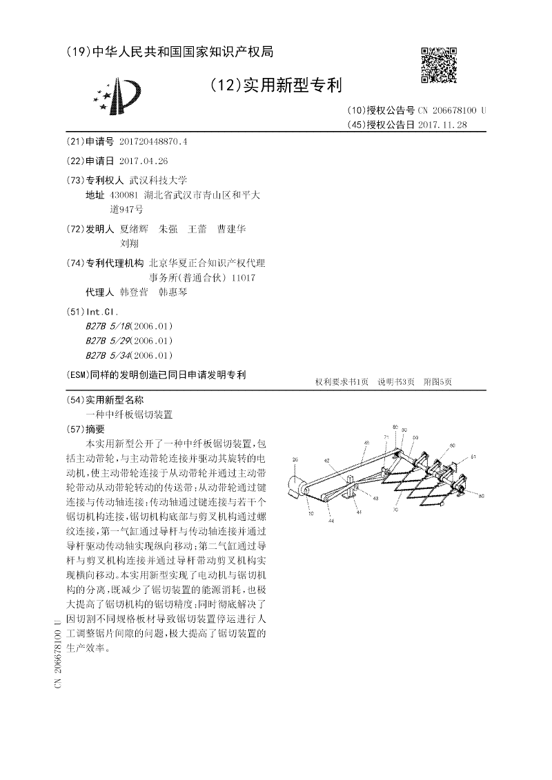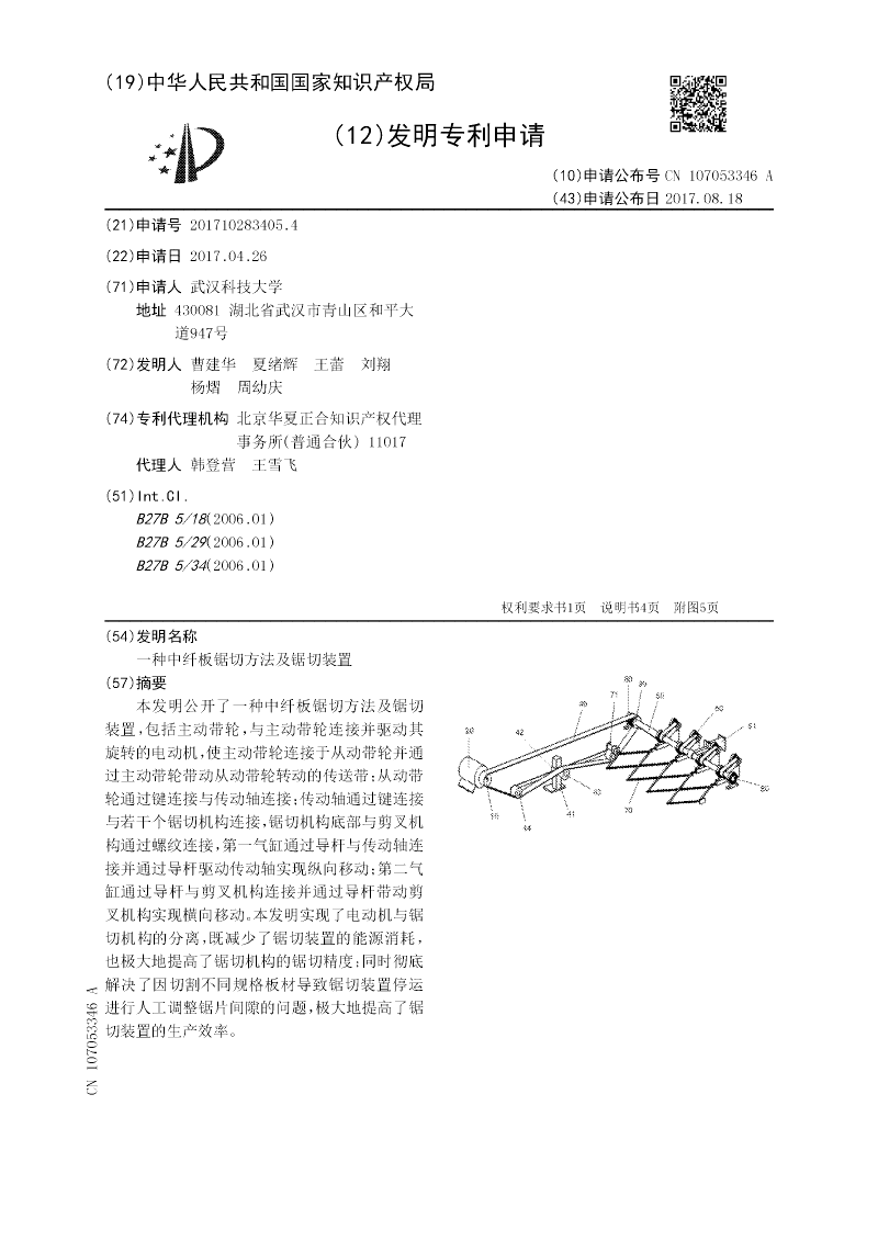 本实用新型公开了一种中纤板锯切装置,包括主动带轮,与主动带轮连接并驱动其旋转的电动机,使主动带轮连接于从动带轮并通过主动带轮带动从动带轮转动的传送带;从动带轮通过键连接与传动轴连接;传动轴通过键连接与若干个锯切机构连接,锯切机构底部与剪叉机构通过螺纹连接,第一气缸通过导杆与传动轴连接并通过导杆驱动传动轴实现纵向移动;第二气缸通过导杆与剪叉机构连接并通过导杆带动剪叉机构实现横向移动。本实用新型实现了电动机与锯切机构的分离,既减少了锯切装置的能源消耗,也极大提高了锯切机构的锯切精度;同时彻底解决了因切割不同规格板材导致锯切装置停运进行人工调整锯片间隙的问题,极大提高了锯切装置的生产效率。
