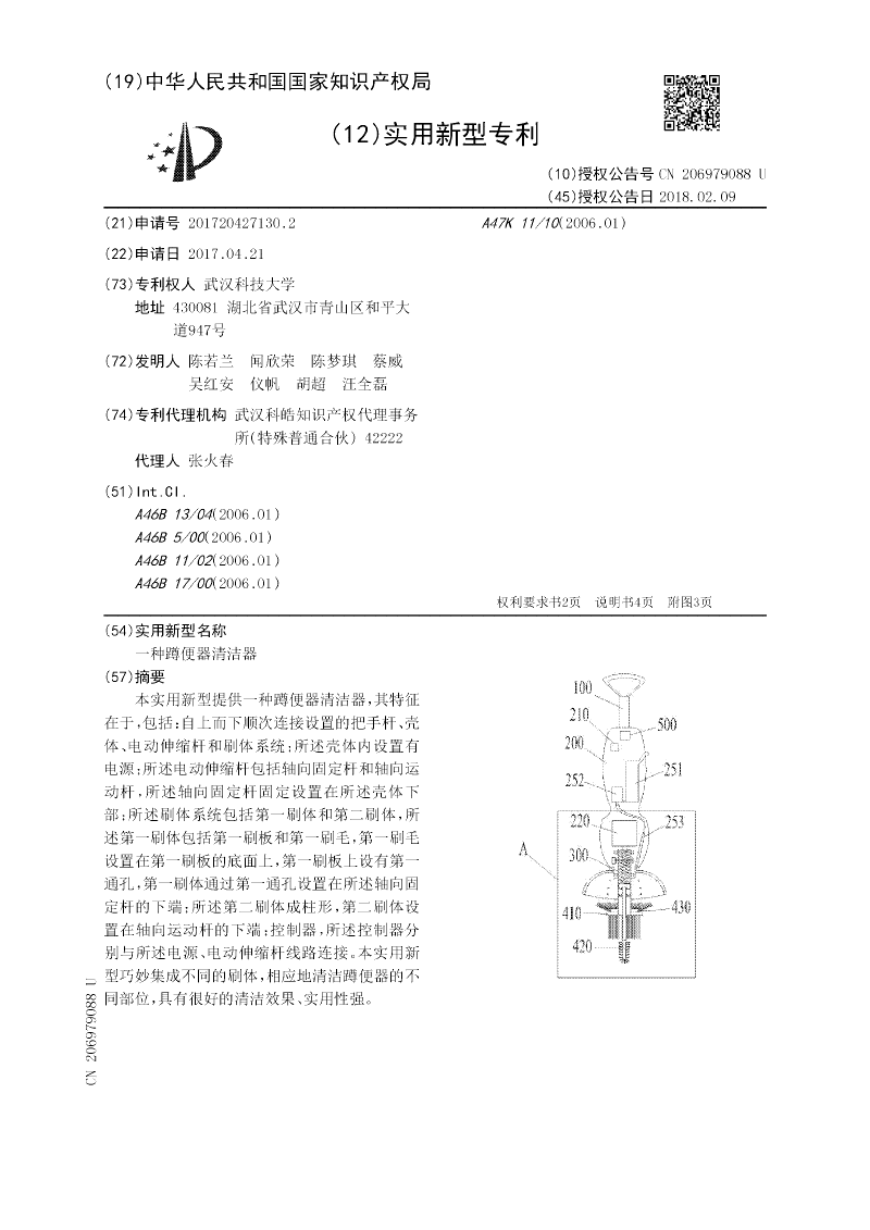 本实用新型提供一种蹲便器清洁器,其特征在于,包括:自上而下顺次连接设置的把手杆、壳体、电动伸缩杆和刷体系统;所述壳体内设置有电源;所述电动伸缩杆包括轴向固定杆和轴向运动杆,所述轴向固定杆固定设置在所述壳体下部;所述刷体系统包括第一刷体和第二刷体,所述第一刷体包括第一刷板和第一刷毛,第一刷毛设置在第一刷板的底面上,第一刷板上设有第一通孔,第一刷体通过第一通孔设置在所述轴向固定杆的下端;所述第二刷体成柱形,第二刷体设置在轴向运动杆的下端;控制器,所述控制器分别与所述电源、电动伸缩杆线路连接。本实用新型巧妙集成不同的刷体,相应地清洁蹲便器的不同部位,具有很好的清洁效果、实用性强。
