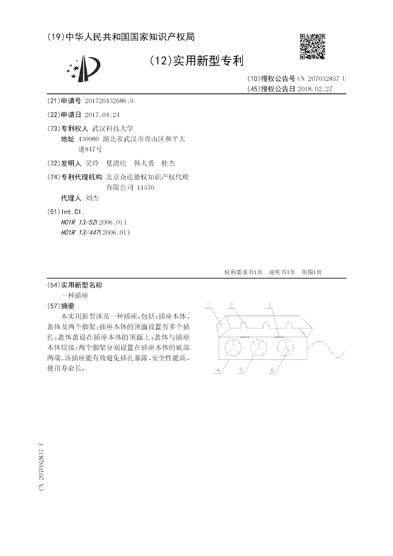 本实用新型涉及一种插座,包括:插座本体、盖体及两个脚架;插座本体的顶面设置有多个插孔;盖体盖设在插座本体的顶面上;盖体与插座本体铰接;两个脚架分别设置在插座本体的底部两端。该插座能有效避免插孔暴露,安全性能高,使用寿命长。