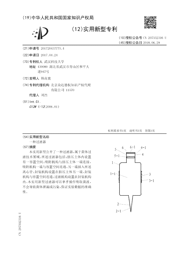 本实用新型公开了一种过滤器,属于菌体过滤技术领域。所述过滤器包括:挤压主体内设置有一容置空间;吸附机构与挤压主体一端连接,吸附机构一端与容置空间连通,另一端插入所述离心管;封装机构设置在挤压主体另一端,封装机构与容置空间连通;过滤机构设置在封装机构内。本实用新型过滤器可以单手操作吸取菌液,不会导致菌体泄漏或污染,保证实验数据的准确性。