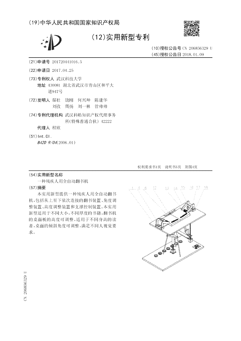 本实用新型提供一种残疾人用全自动翻书机,包括从上至下依次连接的翻书装置、角度调整装置、高度调整装置和支撑控制装置。本实用新型适用于不同大小,不同厚度的书籍,翻书机的桌面板的高度可调整,适用于不同身高的读者,桌面的倾斜角度可调整,满足不同人视觉要求。