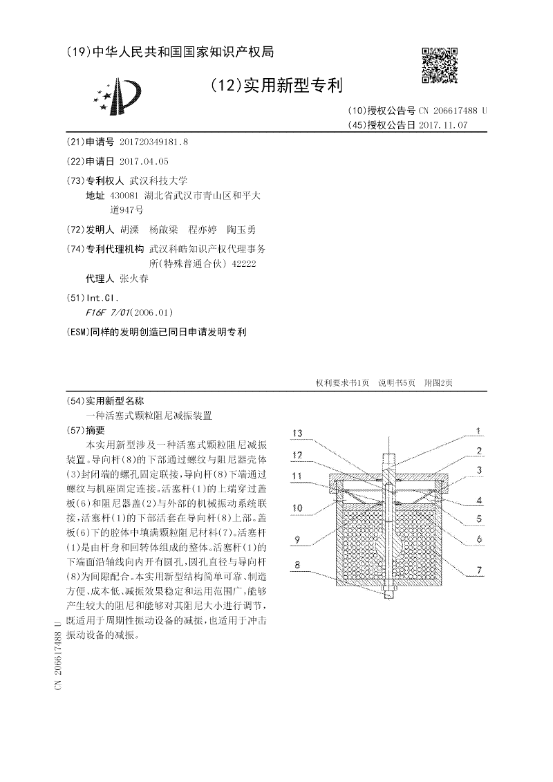 本实用新型涉及一种活塞式颗粒阻尼减振装置。导向杆(8)的下部通过螺纹与阻尼器壳体(3)封闭端的螺孔固定联接,导向杆(8)下端通过螺纹与机座固定连接。活塞杆(1)的上端穿过盖板(6)和阻尼器盖(2)与外部的机械振动系统联接,活塞杆(1)的下部活套在导向杆(8)上部。盖板(6)下的腔体中填满颗粒阻尼材料(7)。活塞杆(1)是由杆身和回转体组成的整体。活塞杆(1)的下端面沿轴线向内开有圆孔,圆孔直径与导向杆(8)为间隙配合。本实用新型结构简单可靠、制造方便、成本低、减振效果稳定和运用范围广,能够产生较大的阻尼和能够对其阻尼大小进行调节,既适用于周期性振动设备的减振,也适用于冲击振动设备的减振。