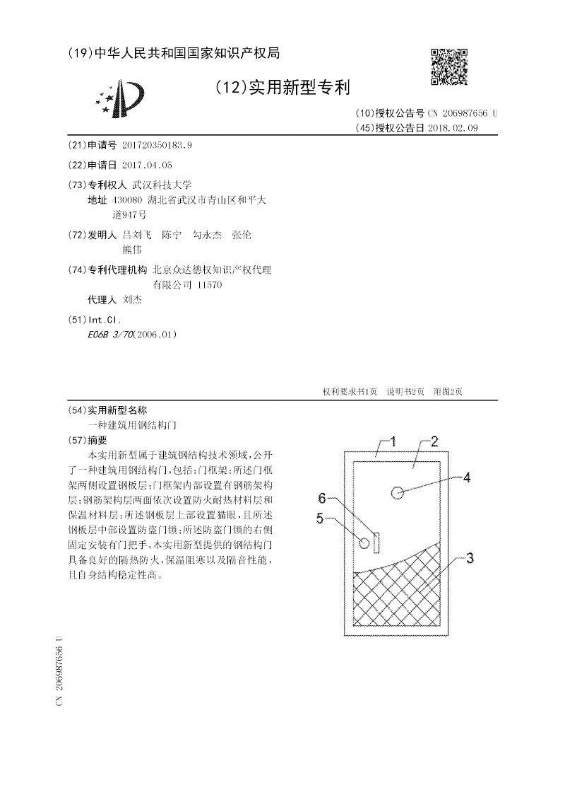 本实用新型属于建筑钢结构技术领域,公开了一种建筑用钢结构门,包括:门框架;所述门框架两侧设置钢板层;门框架内部设置有钢筋架构层;钢筋架构层两面依次设置防火耐热材料层和保温材料层;所述钢板层上部设置猫眼,且所述钢板层中部设置防盗门锁;所述防盗门锁的右侧固定安装有门把手。本实用新型提供的钢结构门具备良好的隔热防火,保温阻寒以及隔音性能,且自身结构稳定性高。