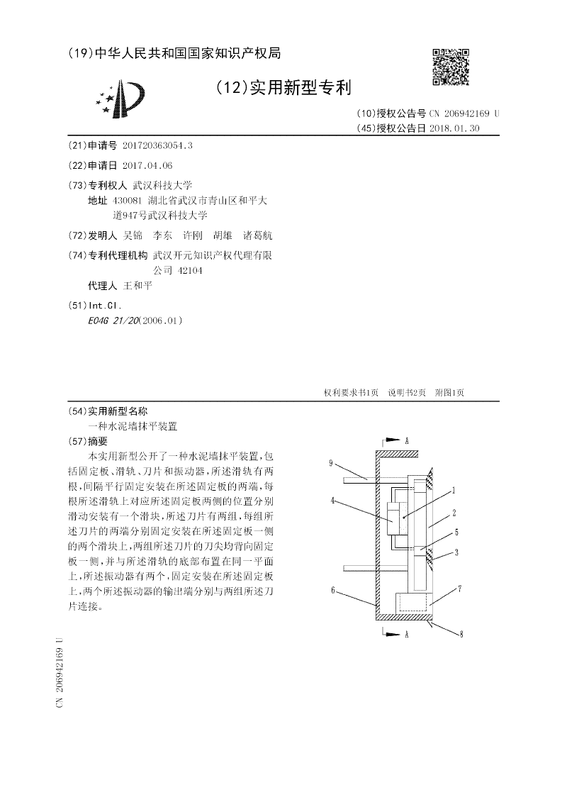 本实用新型公开了一种水泥墙抹平装置,包括固定板、滑轨、刀片和振动器,所述滑轨有两根,间隔平行固定安装在所述固定板的两端,每根所述滑轨上对应所述固定板两侧的位置分别滑动安装有一个滑块,所述刀片有两组,每组所述刀片的两端分别固定安装在所述固定板一侧的两个滑块上,两组所述刀片的刀尖均背向固定板一侧,并与所述滑轨的底部布置在同一平面上,所述振动器有两个,固定安装在所述固定板上,两个所述振动器的输出端分别与两组所述刀片连接。