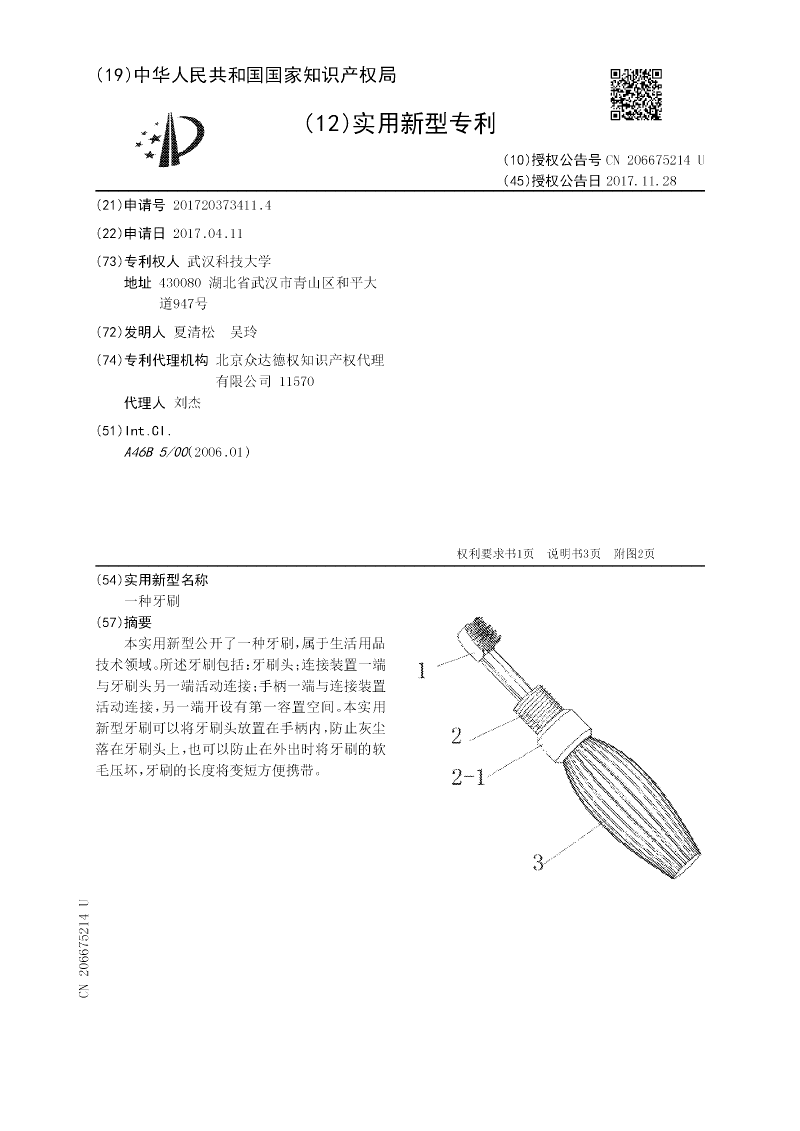 本实用新型公开了一种牙刷,属于生活用品技术领域。所述牙刷包括:牙刷头;连接装置一端与牙刷头另一端活动连接;手柄一端与连接装置活动连接,另一端开设有第一容置空间。本实用新型牙刷可以将牙刷头放置在手柄内,防止灰尘落在牙刷头上,也可以防止在外出时将牙刷的软毛压坏,牙刷的长度将变短方便携带。