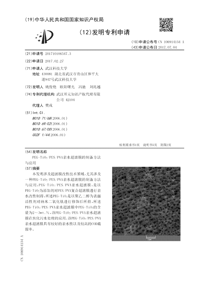 PEG‑TiO2/PES/PVA亲水超滤膜的制备方法与应用