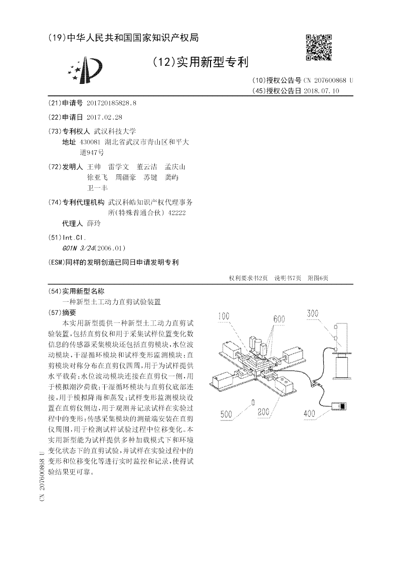 本实用新型提供一种新型土工动力直剪试验装置,包括直剪仪和用于采集试样位置变化数信息的传感器采集模块还包括直剪模块,水位波动模块,干湿循环模块和试样变形监测模块;直剪模块对称分布在直剪仪四周,用于为试样提供水平载荷;水位波动模块连接在直剪仪一侧,用于模拟潮汐荷载;干湿循环模块与直剪仪底部连接,用于模拟降雨和蒸发;试样变形监测模块设置在直剪仪侧边,用于观测并记录试样在实验过程中的变形;传感采集模块的测量端安装在直剪仪周围,用于检测试样试验过程中位移变化。本实用新型能为试样提供多种加载模式下和环境变化状态下的直剪试验,并试样在实验过程中的变形和位移变化等进行实时监控和记录,使得试验结果更可靠。