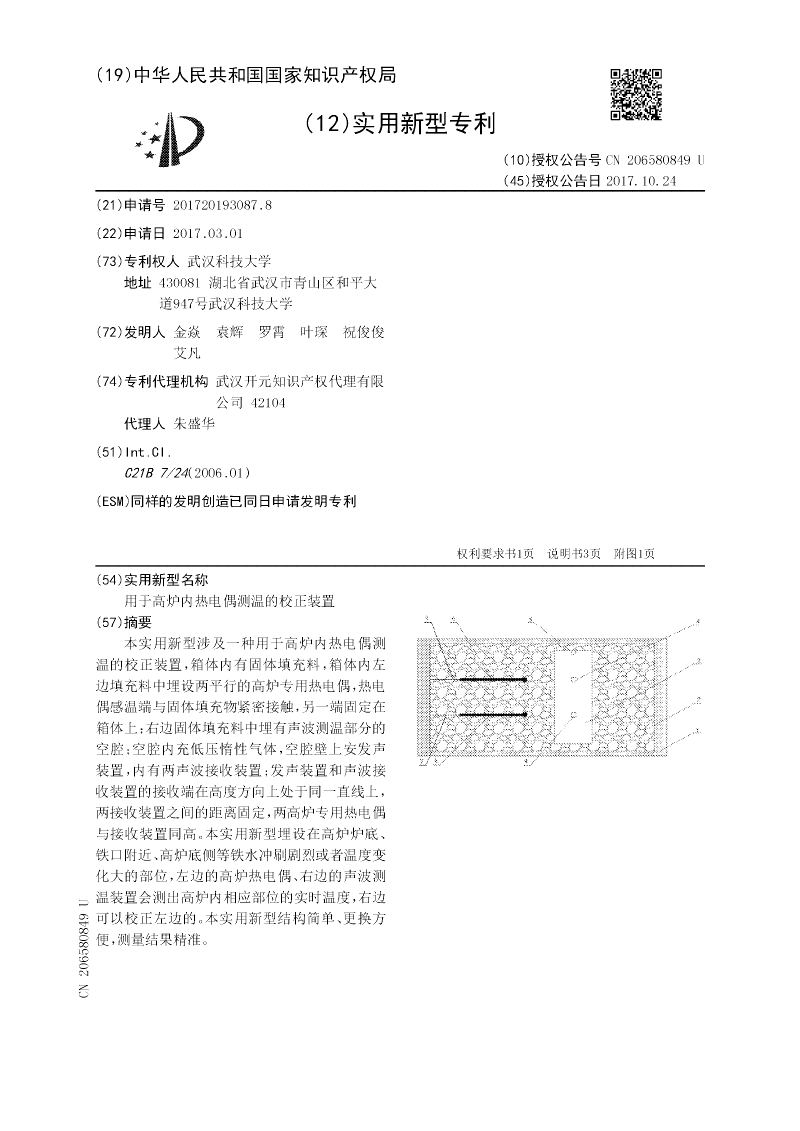 本实用新型涉及一种用于高炉内热电偶测温的校正装置,箱体内有固体填充料,箱体内左边填充料中埋设两平行的高炉专用热电偶,热电偶感温端与固体填充物紧密接触,另一端固定在箱体上;右边固体填充料中埋有声波测温部分的空腔;空腔内充低压惰性气体,空腔壁上安发声装置,内有两声波接收装置;发声装置和声波接收装置的接收端在高度方向上处于同一直线上,两接收装置之间的距离固定,两高炉专用热电偶与接收装置同高。本实用新型埋设在高炉炉底、铁口附近、高炉底侧等铁水冲刷剧烈或者温度变化大的部位,左边的高炉热电偶、右边的声波测温装置会测出高炉内相应部位的实时温度,右边可以校正左边的。本实用新型结构简单、更换方便,测量结果精准。