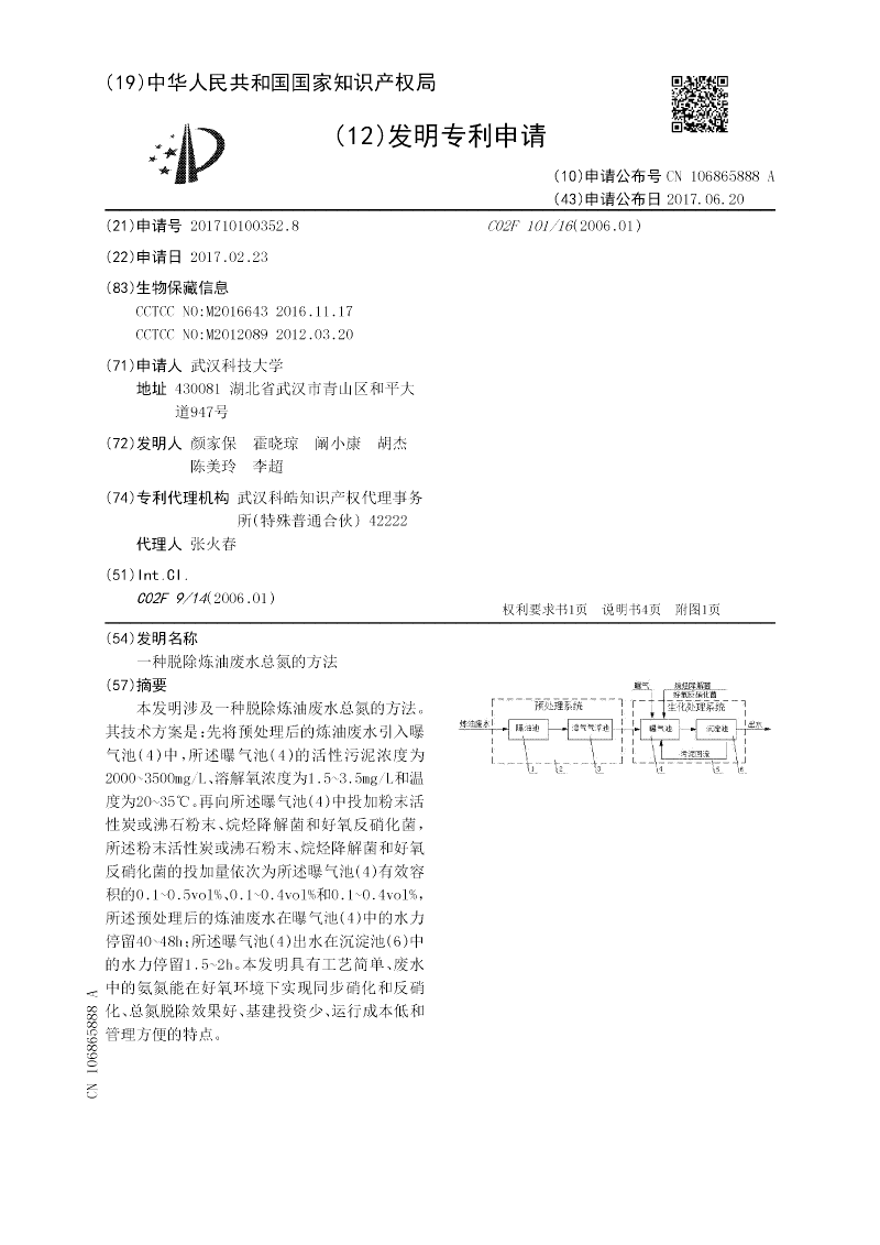 本发明涉及一种脱除炼油废水总氮的方法。其技术方案是:先将预处理后的炼油废水引入曝气池(4)中,所述曝气池(4)的活性污泥浓度为2000~3500mg/L、溶解氧浓度为1.5~3.5mg/L和温度为20~35℃。再向所述曝气池(4)中投加粉末活性炭或沸石粉末、烷烃降解菌和好氧反硝化菌,所述粉末活性炭或沸石粉末、烷烃降解菌和好氧反硝化菌的投加量依次为所述曝气池(4)有效容积的0.1~0.5vol%、0.1~0.4vol%和0.1~0.4vol%,所述预处理后的炼油废水在曝气池(4)中的水力停留40~48h;所述曝气池(4)出水在沉淀池(6)中的水力停留1.5~2h。本发明具有工艺简单、废水中的氨氮能在好氧环境下实现同步硝化和反硝化、总氮脱除效果好、基建投资少、运行成本低和管理方便的特点。