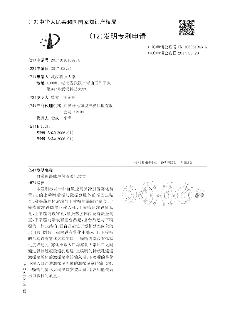 本发明涉及一种自激振荡脉冲射流雾化装置,它的上喷嘴后端与激振荡腔体前端固定贴合,激振荡腔体后端与下喷嘴前端固定贴合,上喷嘴前端设圆筒状输入孔,上喷嘴后端设针状孔,上喷嘴内设锥孔,激振荡腔体内设有激振荡室,下喷嘴前端设有圆台凸起,圆台凸起与下喷嘴为一体式结构,圆台凸起位于激振荡室内部的出口段,圆台凸起内设有雾化小端入口,下喷嘴的后端设有雾化大端出口,下喷嘴内部设有弧状过度段通孔,雾化小端入口与雾化大端出口之间通过弧状过度段通孔连通;上喷嘴的针状孔连通激振荡腔体的激振荡室的输入端,下喷嘴的雾化小端入口连通激振荡腔体的激振荡室的输出端,下喷嘴的雾化大端出口安装风扇。本发明能提高出口雾粒的质量。