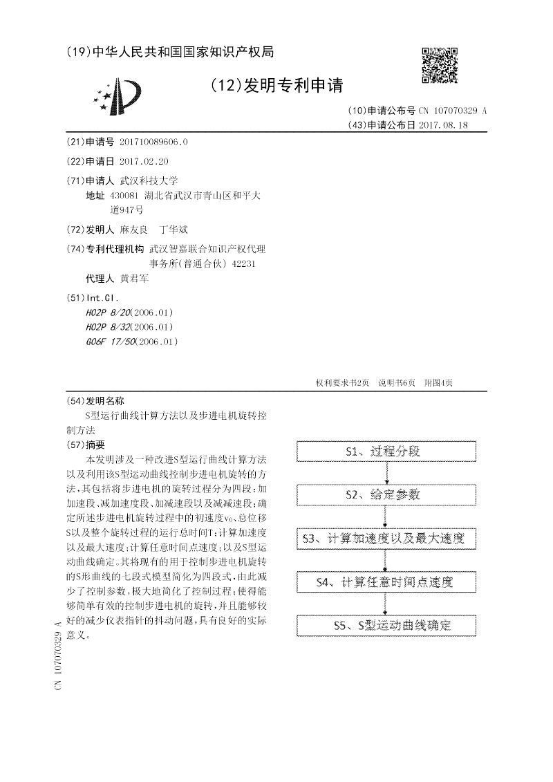 本发明涉及一种改进S型运行曲线计算方法以及利用该S型运动曲线控制步进电机旋转的方法,其包括将步进电机的旋转过程分为四段:加加速段、减加速度段、加减速段以及减减速段;确定所述步进电机旋转过程中的初速度v0、总位移S以及整个旋转过程的运行总时间T;计算加速度以及最大速度;计算任意时间点速度;以及S型运动曲线确定。其将现有的用于控制步进电机旋转的S形曲线的七段式模型简化为四段式,由此减少了控制参数,极大地简化了控制过程;使得能够简单有效的控制步进电机的旋转,并且能够较好的减少仪表指针的抖动问题,具有良好的实际意义。