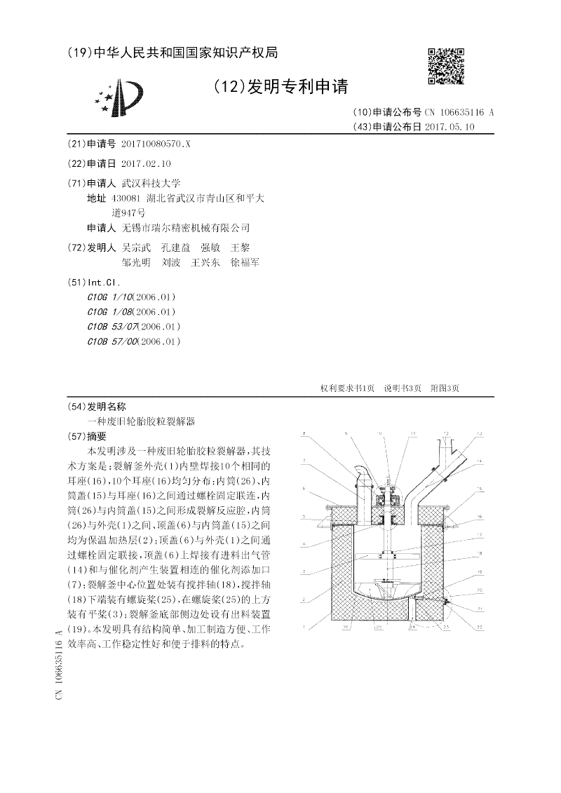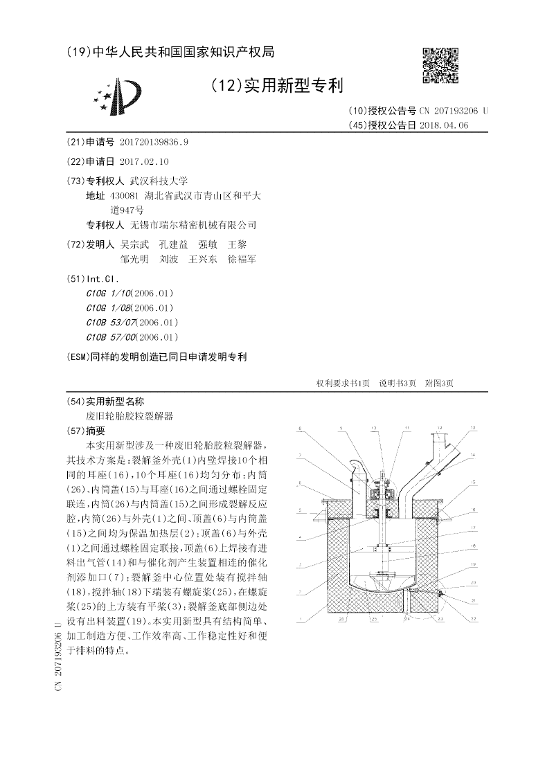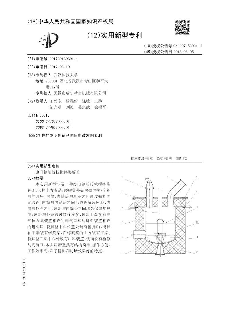 本实用新型涉及一种废旧轮胎胶粒搅拌裂解釜,其技术方案是:裂解釜外壳内壁焊接8个相同的耳座,内筒、内筒盖与耳座之间通过螺栓固定联连,内筒与内筒盖之间形成裂解反应腔,内筒与外壳之间、顶盖与内筒盖之间均为保温加热层;顶盖与外壳通过螺栓连接,顶盖上焊接有与气体收集装置相连的排气口和与进料装置相连的进料口;裂解釜中心位置处装有搅拌轴,搅拌轴下端装有螺旋桨,在螺旋桨的上方装有平桨;裂解釜底部中心处设有出料装置,侧面设有检修与观测口。本实用新型具有结构简单、操作方便、工作效率高、利于排料和防堵效果好的特点。
