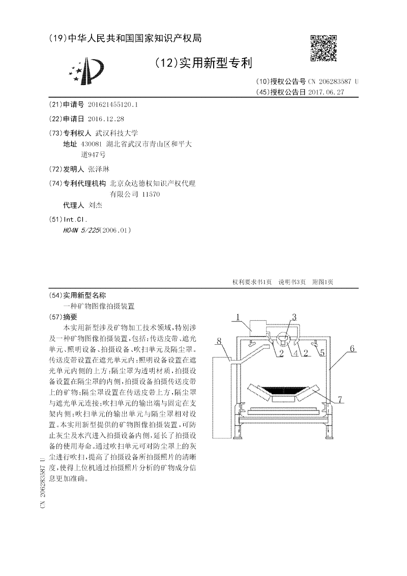 本实用新型涉及矿物加工技术领域,特别涉及一种矿物图像拍摄装置,包括:传送皮带、遮光单元、照明设备、拍摄设备、吹扫单元及隔尘罩。传送皮带设置在遮光单元内;照明设备设置在遮光单元内侧的上方;隔尘罩为透明材质,拍摄设备设置在隔尘罩的内侧,拍摄设备拍摄传送皮带上的矿物;隔尘罩设置在传送皮带上方,隔尘罩与遮光单元连接;吹扫单元的输出端与固定在支架内侧;吹扫单元的输出单元与隔尘罩相对设置。本实用新型提供的矿物图像拍摄装置,可防止灰尘及水汽进入拍摄设备内侧,延长了拍摄设备的使用寿命。通过吹扫单元可对防尘罩上的灰尘进行吹扫,提高了拍摄设备所拍摄照片的清晰度,使得上位机通过拍摄照片分析的矿物成分信息更加准确。
