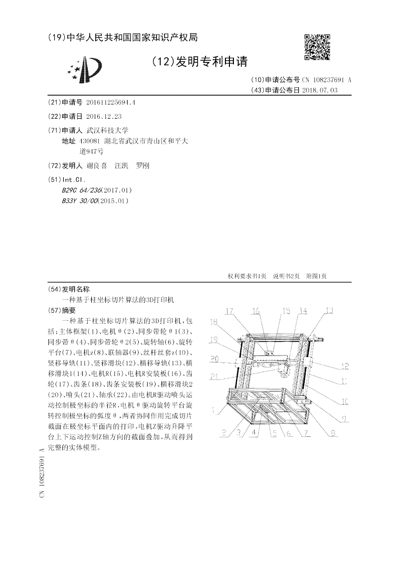 一种基于柱坐标切片算法的3D打印机,包括:主体框架(1)、电机θ(2)、同步带轮θ1(3)、同步带θ(4)、同步带轮θ2(5)、旋转轴(6)、旋转平台(7)、电机z(8)、联轴器(9)、丝杆丝套z(10)、竖移导轨(11)、竖移滑块(12)、横移导轨(13)、横移滑块1(14)、电机R(15)、电机R安装板(16)、齿轮(17)、齿条(18)、齿条安装板(19)、横移滑块2(20)、喷头(21)、轴承(22)。由电机R驱动喷头运动控制极坐标的半径R,电机θ驱动旋转平台旋转控制极坐标的弧度θ,两者协同作用完成切片截面在极坐标平面内的打印,电机Z驱动升降平台上下运动控制Z轴方向的截面叠加,从而得到完整的实体模型。