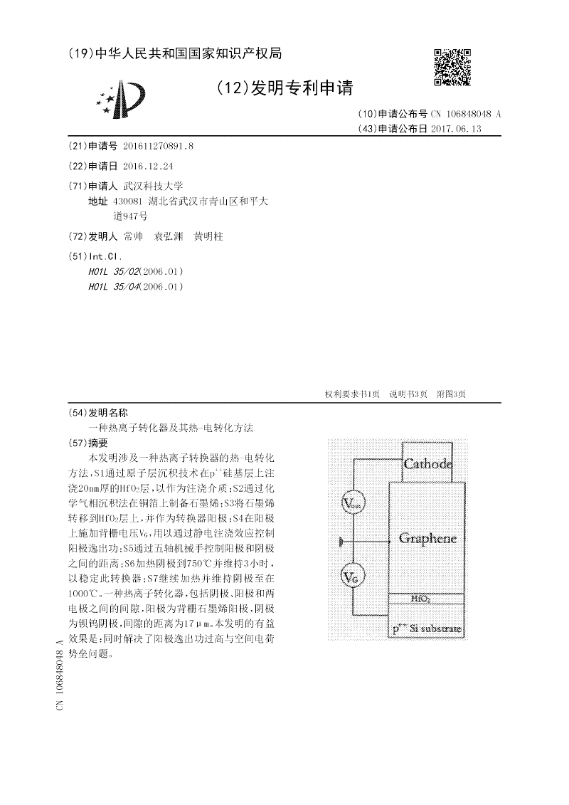 本发明涉及一种热离子转换器的热‑电转化方法,S1通过原子层沉积技术在p++硅基层上注浇20nm厚的HfO2层,以作为注浇介质;S2通过化学气相沉积法在铜箔上制备石墨烯;S3将石墨烯转移到HfO2层上,并作为转换器阳极;S4在阳极上施加背栅电压VG,用以通过静电注浇效应控制阳极逸出功;S5通过五轴机械手控制阳极和阴极之间的距离;S6加热阴极到750℃并维持3小时,以稳定此转换器;S7继续加热并维持阴极至在1000℃。一种热离子转化器,包括阴极、阳极和两电极之间的间隙,阳极为背栅石墨烯阳极,阴极为钡钨阴极,间隙的距离为17μm。本发明的有益效果是:同时解决了阳极逸出功过高与空间电荷势垒问题。
