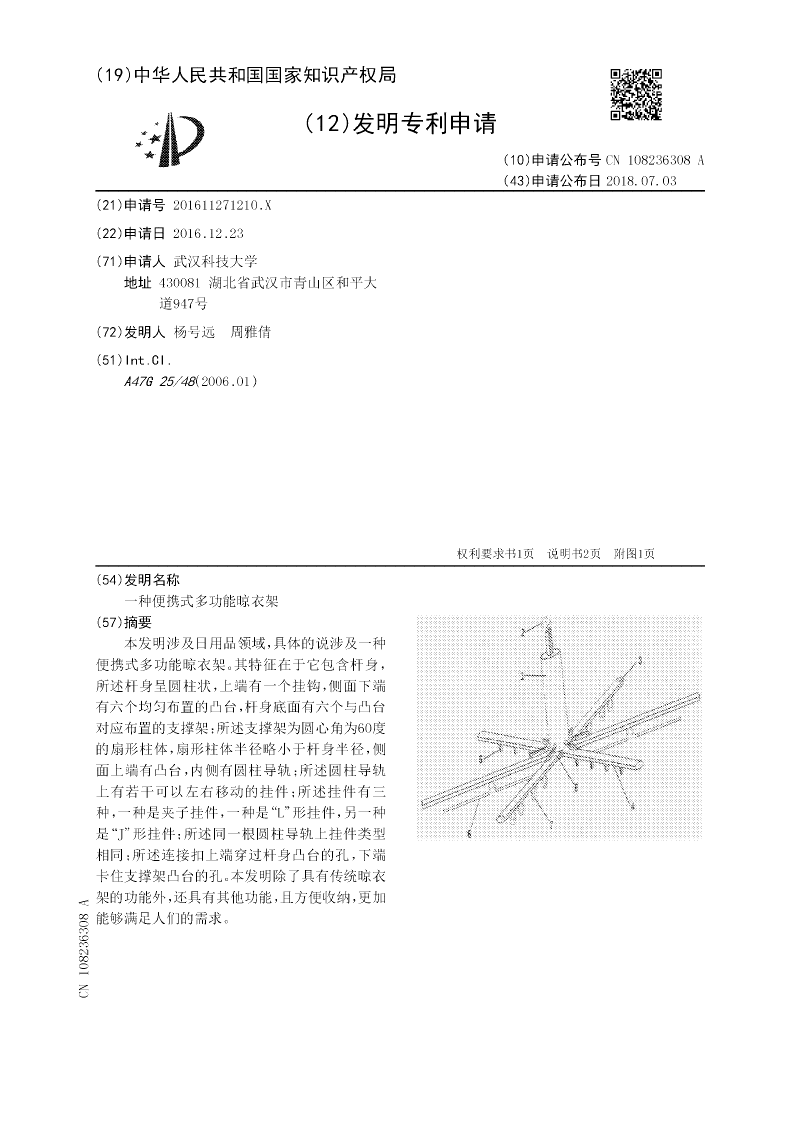 本发明涉及日用品领域,具体的说涉及一种便携式多功能晾衣架。其特征在于它包含杆身,所述杆身呈圆柱状,上端有一个挂钩,侧面下端有六个均匀布置的凸台,杆身底面有六个与凸台对应布置的支撑架;所述支撑架为圆心角为60度的扇形柱体,扇形柱体半径略小于杆身半径,侧面上端有凸台,内侧有圆柱导轨;所述圆柱导轨上有若干可以左右移动的挂件;所述挂件有三种,一种是夹子挂件,一种是“L”形挂件,另一种是“J”形挂件;所述同一根圆柱导轨上挂件类型相同;所述连接扣上端穿过杆身凸台的孔,下端卡住支撑架凸台的孔。本发明除了具有传统晾衣架的功能外,还具有其他功能,且方便收纳,更加能够满足人们的需求。