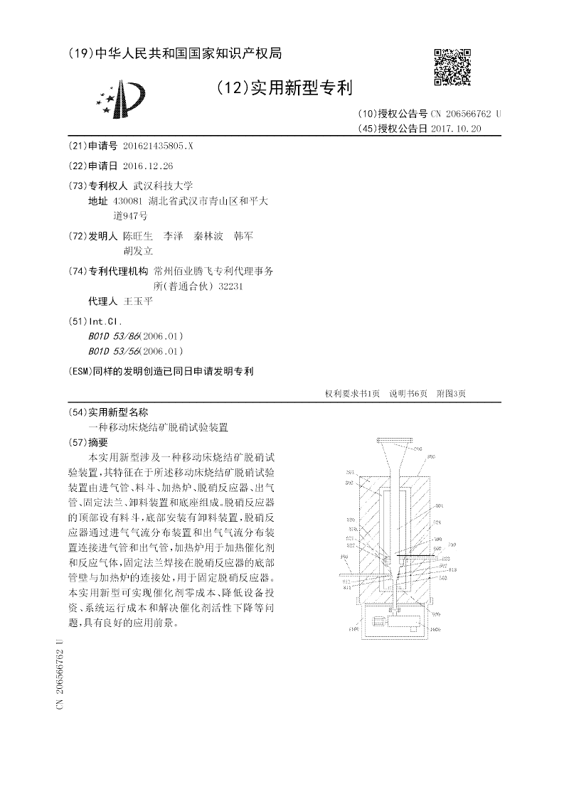 本实用新型涉及一种移动床烧结矿脱硝试验装置,其特征在于所述移动床烧结矿脱硝试验装置由进气管、料斗、加热炉、脱硝反应器、出气管、固定法兰、卸料装置和底座组成。脱硝反应器的顶部设有料斗,底部安装有卸料装置,脱硝反应器通过进气气流分布装置和出气气流分布装置连接进气管和出气管,加热炉用于加热催化剂和反应气体,固定法兰焊接在脱硝反应器的底部管壁与加热炉的连接处,用于固定脱硝反应器。本实用新型可实现催化剂零成本、降低设备投资、系统运行成本和解决催化剂活性下降等问题,具有良好的应用前景。