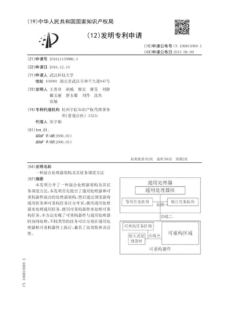 本发明公开了一种混合处理器架构及其任务调度方法。本发明首先提出了通用处理器和可重构器件混合的处理器架构,然后通过调度器将通用任务和可重构任务区分开来;使用通用处理器来处理通用任务,使用可重构器件来处理可重构任务。本方法实现了可重构器件与通用处理器的协同处理,不同类型的任务可以分别在通用处理器核可重构器件上执行,兼具了高效性和灵活性。