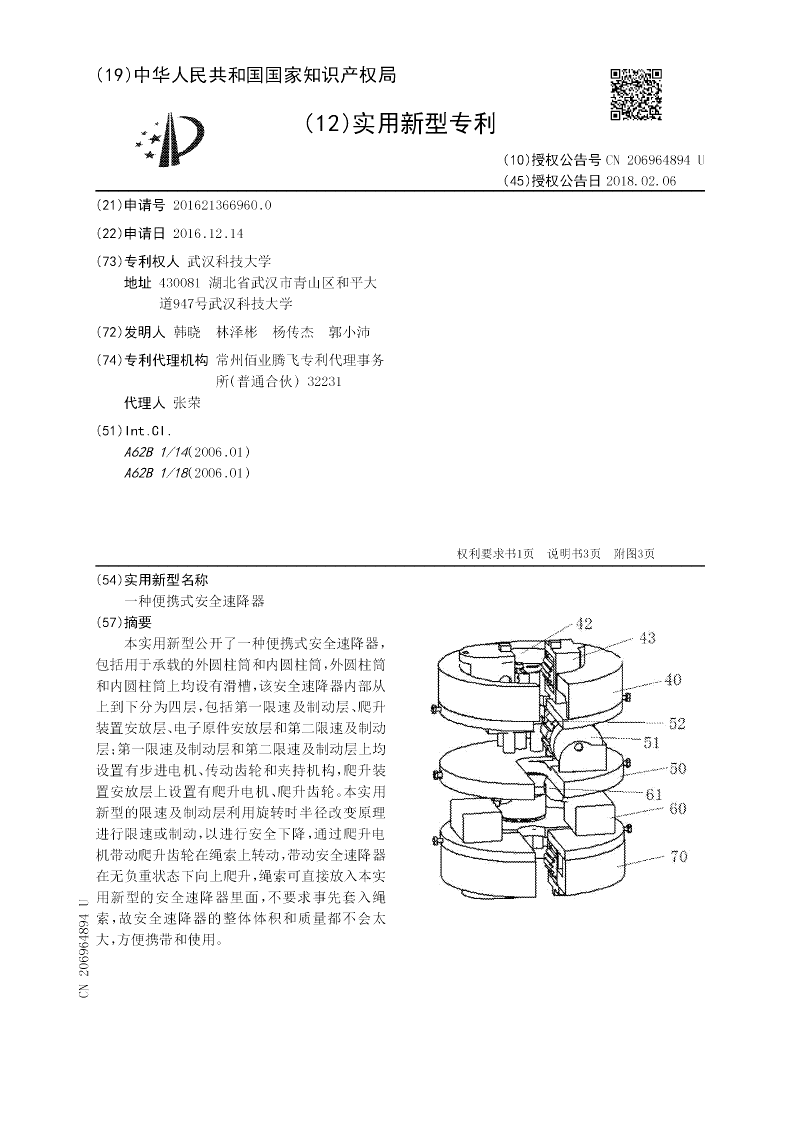 本实用新型公开了一种便携式安全速降器,包括用于承载的外圆柱筒和内圆柱筒,外圆柱筒和内圆柱筒上均设有滑槽,该安全速降器内部从上到下分为四层,包括第一限速及制动层、爬升装置安放层、电子原件安放层和第二限速及制动层;第一限速及制动层和第二限速及制动层上均设置有步进电机、传动齿轮和夹持机构,爬升装置安放层上设置有爬升电机、爬升齿轮。本实用新型的限速及制动层利用旋转时半径改变原理进行限速或制动,以进行安全下降,通过爬升电机带动爬升齿轮在绳索上转动,带动安全速降器在无负重状态下向上爬升,绳索可直接放入本实用新型的安全速降器里面,不要求事先套入绳索,故安全速降器的整体体积和质量都不会太大,方便携带和使用。