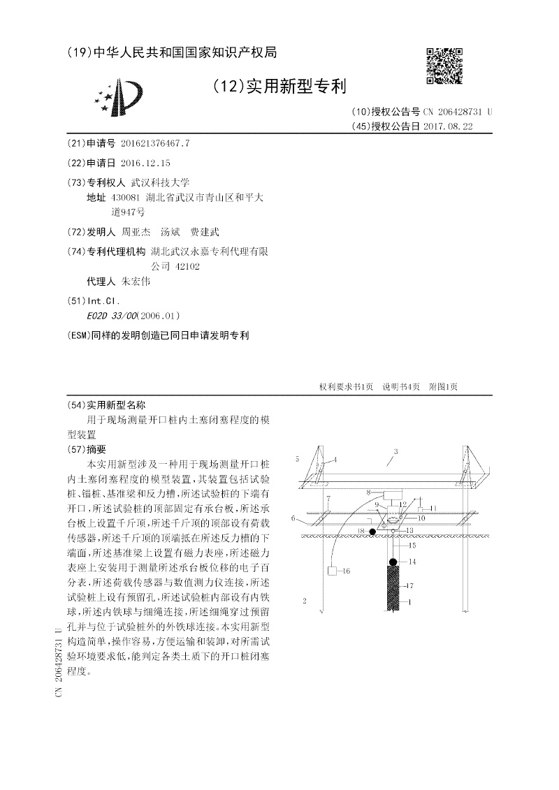 本实用新型涉及一种用于现场测量开口桩内土塞闭塞程度的模型装置,其装置包括试验桩、锚桩、基准梁和反力槽,所述试验桩的下端有开口,所述试验桩的顶部固定有承台板,所述承台板上设置千斤顶,所述千斤顶的顶部设有荷载传感器,所述千斤顶的顶端抵在所述反力槽的下端面,所述基准梁上设置有磁力表座,所述磁力表座上安装用于测量所述承台板位移的电子百分表,所述荷载传感器与数值测力仪连接,所述试验桩上设有预留孔,所述试验桩内部设有内铁球,所述内铁球与细绳连接,所述细绳穿过预留孔并与位于试验桩外的外铁球连接。本实用新型构造简单,操作容易,方便运输和装卸,对所需试验环境要求低,能判定各类土质下的开口桩闭塞程度。