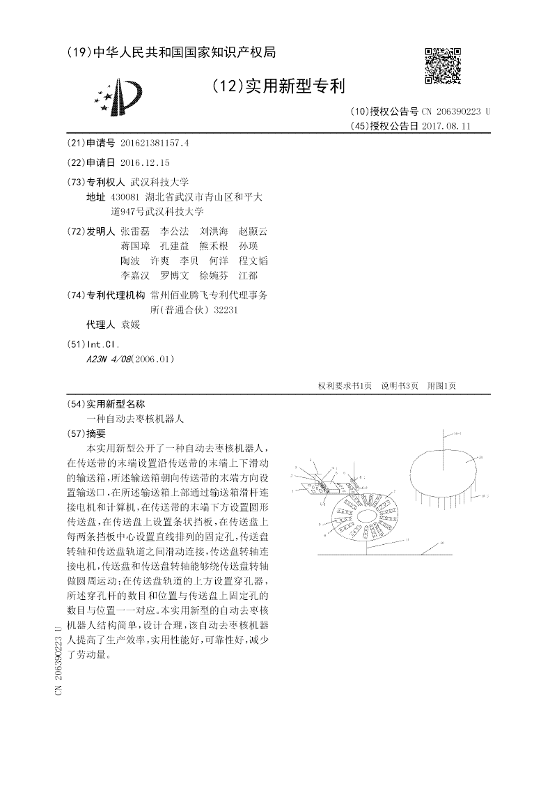 本实用新型公开了一种自动去枣核机器人,在传送带的末端设置沿传送带的末端上下滑动的输送箱,所述输送箱朝向传送带的末端方向设置输送口,在所述输送箱上部通过输送箱滑杆连接电机和计算机,在传送带的末端下方设置圆形传送盘,在传送盘上设置条状挡板,在传送盘上每两条挡板中心设置直线排列的固定孔,传送盘转轴和传送盘轨道之间滑动连接,传送盘转轴连接电机,传送盘和传送盘转轴能够绕传送盘转轴做圆周运动;在传送盘轨道的上方设置穿孔器,所述穿孔杆的数目和位置与传送盘上固定孔的数目与位置一一对应。本实用新型的自动去枣核机器人结构简单,设计合理,该自动去枣核机器人提高了生产效率,实用性能好,可靠性好,减少了劳动量。