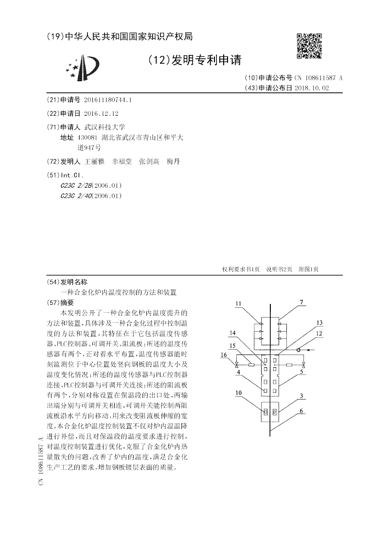 本发明公开了一种合金化炉内温度提升的方法和装置,具体涉及一种合金化过程中控制温度的方法和装置,其特征在于它包括温度传感器、PLC控制器、可调开关、阻流板;所述的温度传感器有两个,正对着水平布置,温度传感器能时刻监测位于中心位置处竖向钢板的温度大小及温度变化情况;所述的温度传感器与PLC控制器连接,PLC控制器与可调开关连接;所述的阻流板有两个,分别对称设置在保温段的出口处,两输出端分别与可调开关相连,可调开关能控制两阻流板沿水平方向移动,用来改变阻流板伸缩的宽度。本合金化炉温度控制装置不仅对炉内温温降进行补偿,而且对保温段的温度要求进行控制,对温度控制装置进行优化,克服了合金化炉内热量散失的问题,改善了炉内的温度,满足合金化生产工艺的要求,增加钢板镀层表面的质量。