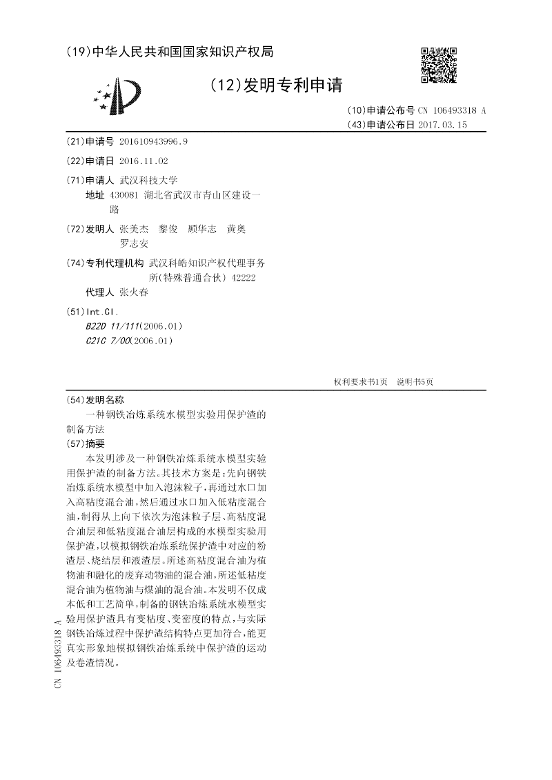 本发明涉及一种钢铁冶炼系统水模型实验用保护渣的制备方法。其技术方案是:先向钢铁冶炼系统水模型中加入泡沫粒子,再通过水口加入高粘度混合油,然后通过水口加入低粘度混合油,制得从上向下依次为泡沫粒子层、高粘度混合油层和低粘度混合油层构成的水模型实验用保护渣,以模拟钢铁冶炼系统保护渣中对应的粉渣层、烧结层和液渣层。所述高粘度混合油为植物油和融化的废弃动物油的混合油,所述低粘度混合油为植物油与煤油的混合油。本发明不仅成本低和工艺简单,制备的钢铁冶炼系统水模型实验用保护渣具有变粘度、变密度的特点,与实际钢铁冶炼过程中保护渣结构特点更加符合,能更真实形象地模拟钢铁冶炼系统中保护渣的运动及卷渣情况。