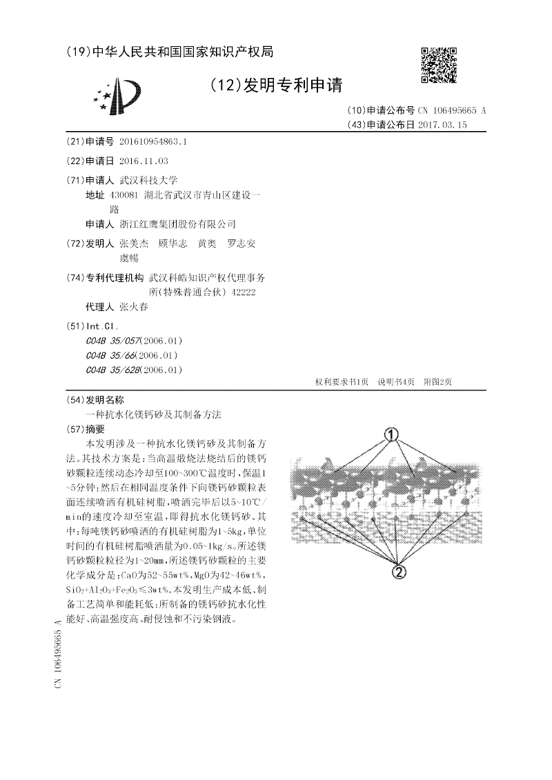 本发明涉及一种抗水化镁钙砂及其制备方法。其技术方案是:当高温煅烧法烧结后的镁钙砂颗粒连续动态冷却至100~300℃温度时,保温1~5分钟;然后在相同温度条件下向镁钙砂颗粒表面连续喷洒有机硅树脂,喷洒完毕后以5~10℃/min的速度冷却至室温,即得抗水化镁钙砂。其中:每吨镁钙砂喷洒的有机硅树脂为1~5kg,单位时间的有机硅树脂喷洒量为0.05~1kg/s。所述镁钙砂颗粒粒径为1~20mm,所述镁钙砂颗粒的主要化学成分是:CaO为52~55wt%,MgO为42~46wt%,SiO2+Al2O3+Fe2O3≤3wt%。本发明生产成本低、制备工艺简单和能耗低;所制备的镁钙砂抗水化性能好、高温强度高、耐侵蚀和不污染钢液。
